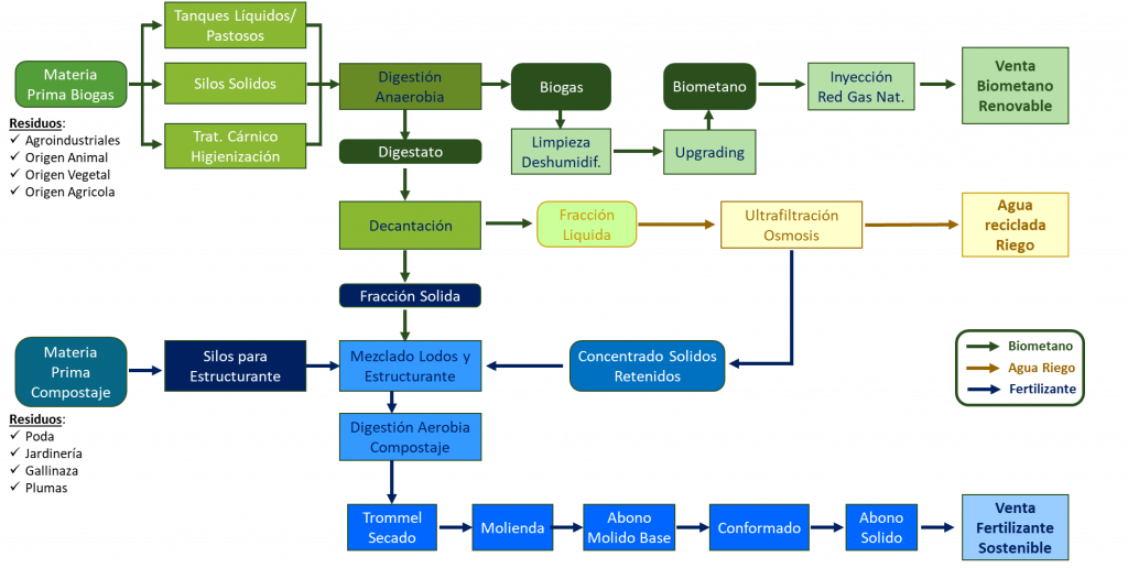La Planta de Biogás es una instalación de reciclado de residuos orgánicos no peligrosos por medio de digestión anaerobia (en ausencia de oxígeno). Con posterior compostaje (digestión aerobica) y procesado de su digestado hasta obtener un producto fertilizante CE.